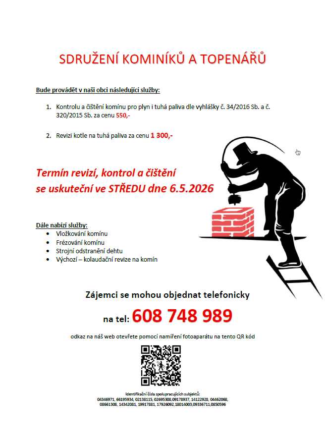 Kominictví a topen. servis nabízí 6. 5. čištění a revizi komínů a kotlů. Objednávejte na tel. 608 748 989. Cena: 550 Kč/komín, 1300 Kč/t.kotel.