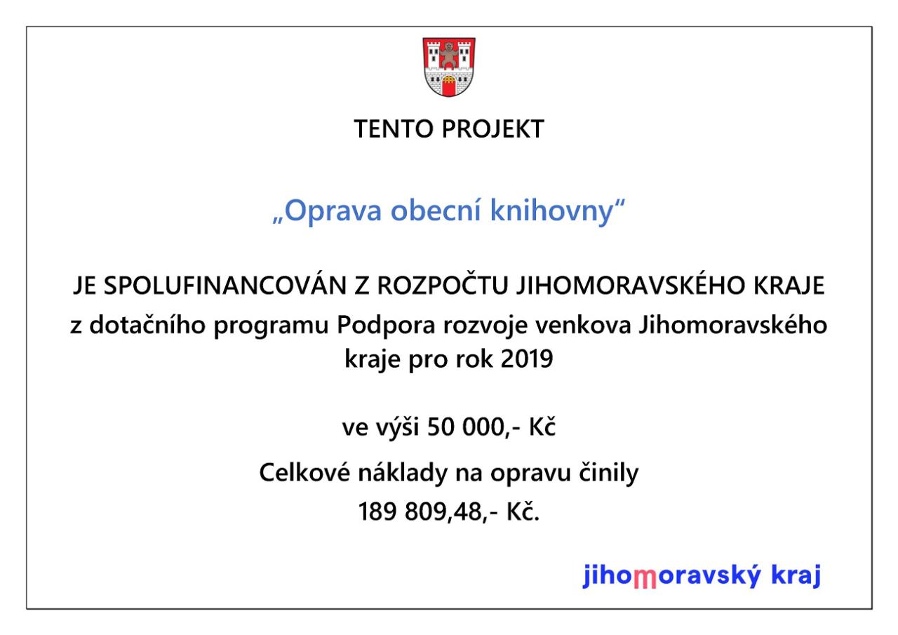 Tento projekt „Oprava obecní knihovny“ je spolufinancován z rozpočtu Jihomoravského kraje z dotačního programu Podpora rozvoje venkova Jihomoravského kraje pro rok 2019 ve výši 50 000 Kč.